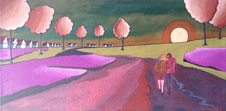 Mes tableaux sont du style impressionniste. Je choisi une saison, un mois, une heure de la journée. Ensuite je représente un certain sentiment humain qui, en même temps s’apparente à cette journée de l’année. Je dessine un paysage au crayon, sans règlement ou restriction sur les dimensions et les formes. Ensuite j’y mets de la couleur en peinture. Le temps est un élément très présent dans mes toiles. Peut-être que c’est un souvenir du passé, un instant immortalisé dans le moment présent ou un rêve d’un avenir meilleur avant l’inévitable fin. J’utilise l’acrylique dans tous mes tableaux. Pour de vrai, c’est un jeu de couleurs.