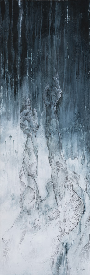 À partir d’une structure de base, mon intuition me guide dans une dualité naturelle. J’utilise les contrastes, la force de la ligne, le côté vaporeux, l’abstraction et la figuration. Et voilà un moment d’arrêt, en suspens, une liberté, un silence…un mouvement.