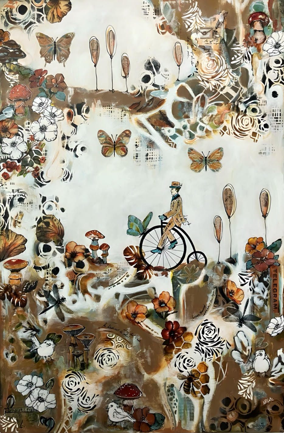 Ma démarche s’inspire de l’écriture : je compose mes œuvres comme des récits visuels. L’intuition, l’imaginaire et l’émotion guident la construction de mes tableaux, où se mêlent textures, matières et superpositions. Je privilégie les approches mixtes afin de créer des œuvres qui invitent à la contemplation, à la lecture intime et à l’interprétation personnelle. De plus, les techniques mixtes me permettent de parler plusieurs langues visuelles.